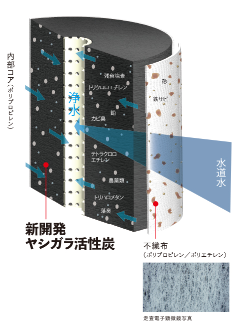 新開発したカーボンフィルターの活性炭は、主にヤシガラ炭を原料とし、製造時に微細孔径・細孔容積を調整することで、様々な大きさの微粒子を吸着することができる様に改良し、高い洗浄性能と目詰まりのしいくさの両立を実現しました。