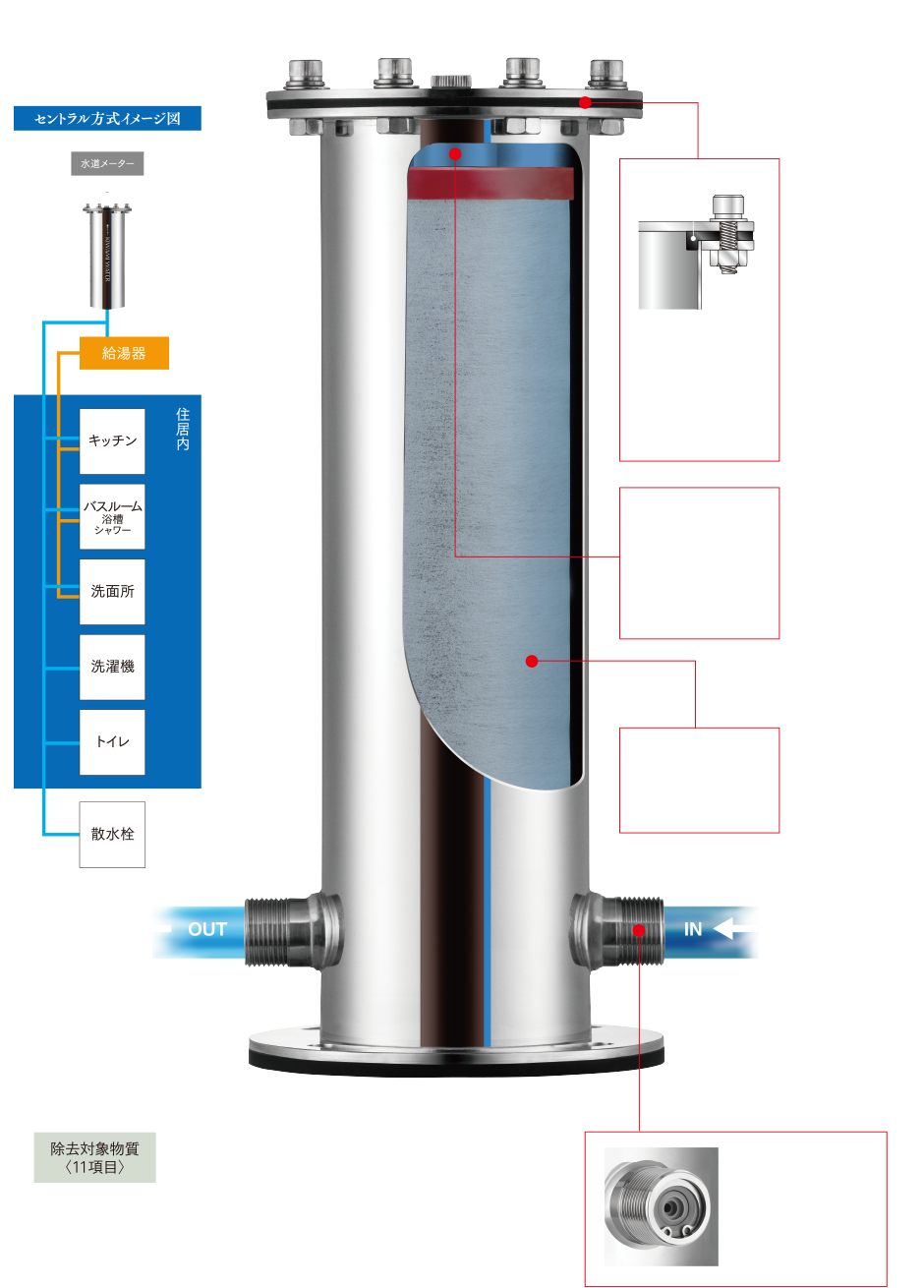 腐食を起こす酸化作用のある塩素や有害物質、そして様々な不純物を除去することで、住宅全体の水道管や給湯器・温水器などの耐久性が格段にアップします。